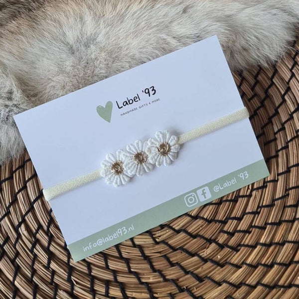 Leuk en handig haarbandje met 3 bloemetjes (madeliefjes) erop. Houdt de haren van je kindje uit het gezicht en staat ook nog eens super leuk in de haren. Het haarbandje zit op een heerlijk zacht en rekbaar elastiek. Deze is te gebruiken vanaf baby tot 3 jaar.